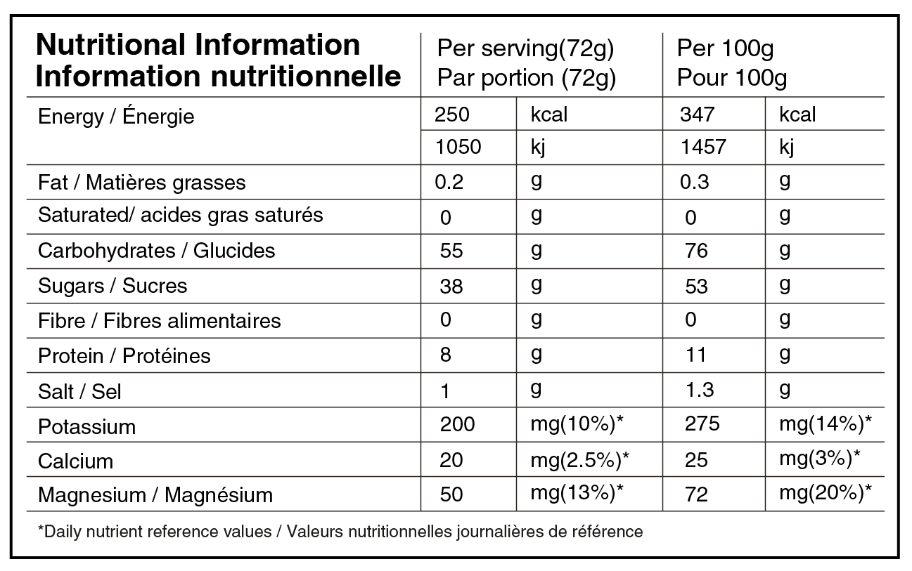 - 55g carbohydrates: simple and complex natural carbohydrates