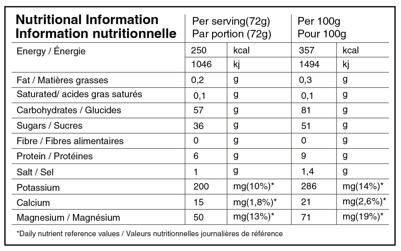 Ingredients: Sugars (dextrose, maltodextrin, Palatinose™ (isomaltulose)*), canola protein isolate, natural pineapple flavor, citric acid, sea salt, potassium citrate, magnesium citrate, ginseng.